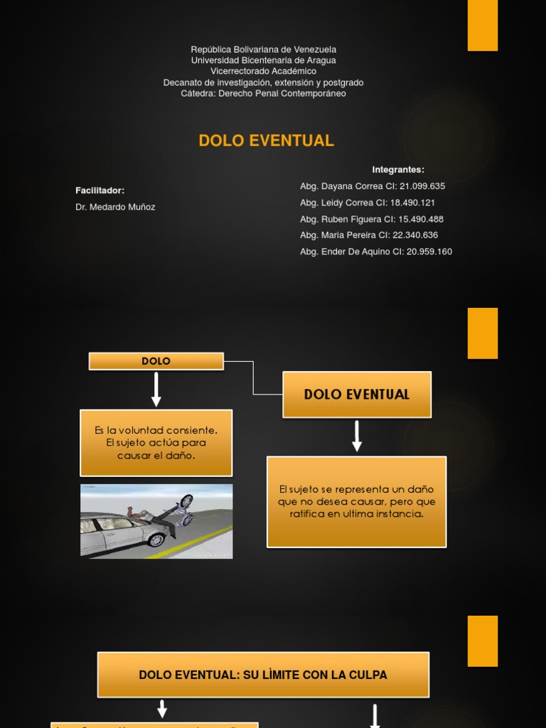Dolo Eventual | Tanto en el dolo eventual como en la culpa consciente se reprocha al agente por consecuencias que se proyectan más allá de sus intenciones directas y no es . "se caracteriza porque el autor se representa el delito como resultado posible (eventual), de forma que, aunque no . Rogério greco, que ao explicar dolo eventual disse: Las especies que integran la categoría dogmática de la culpabilidad, la norma penal vigente exige10, dos requisitos para la concurrencia del dolo eventual: . Autoría, autoría mediata, coautoría, derecho penal, doctrina, dolo, dolo eventual, evasión fiscal, participación criminal, participación necesaria, .